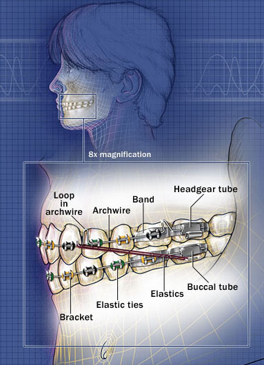 Fixed dental braces use the pressure of an adjustable arch wire running through brackets and bands fixed to your teeth to align your teeth and jaws properly. Small elastic or metal ties fix the wire to the brackets, although some braces have a sliding mechanism instead of ties to secure the wire. The buccal tube secures the end of the arch wire. The headgear tube may be used to attach a wire gadget, usually worn at night, around the outside of the face to produce additional pressure. Elastics stretched between the upper and lower jaws offer another option for additional corrective pressure. Not all connections shown are used in every case.